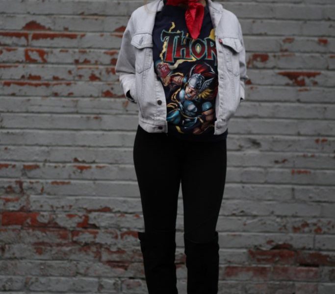 So, I’ve always been a fan of superheroes, whether that be in comic books or movies. When I saw this oversized Thor T-shirt, you can assure I was jumping for joy. Who doesn’t love a good graphic tee? Dress it up with a skirt and blazer or dress it down with ripped jeans, graphic tees are a staple in every Fashionista’s wardrobe because they are so versatile. Along with being comfortable, graphic tees have recently been spotted on the runways, including designers like Haider Ackermann, Iceberg an Coach, making them super trendy. For the finishing touch, I grabbed a simple red bandana handkerchief, which also adds to the graphic nature of the tee.