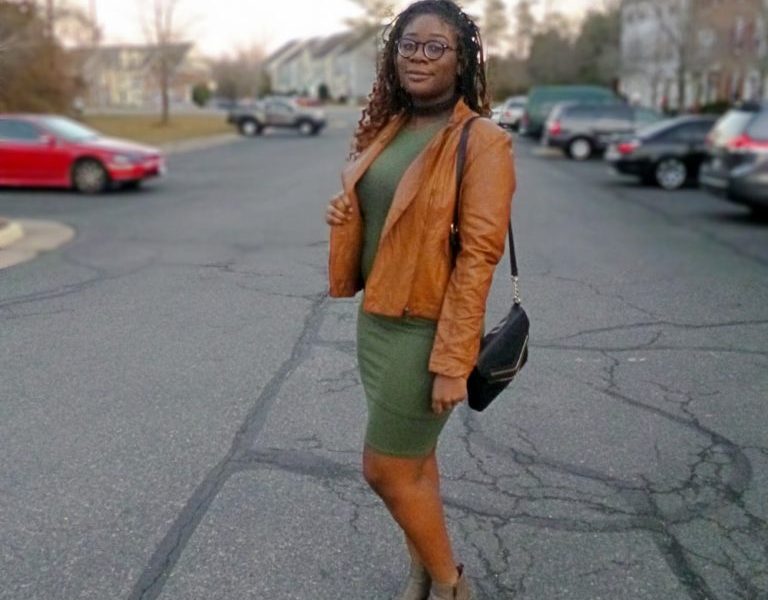 I paired this green dress with this awesome faux leather jacket that I found at the thrift shop and cute sage colored booties. I accessorized with a crossbody bag and a choker. I’m obsessed with the ’90s choker trend that came back, and I always pair it with as many outfits as I can. Leather jackets are my favorite types of jackets to wear when the weather gets colder. They can look great with just about any outfit.
