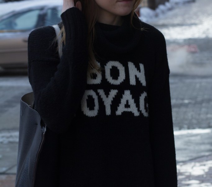 While I absolutely loved the Chanel versions of the turtlenecks that Cara Delevingne and Kendall Jenner wore down the runway, I just can’t pull off such dramatic looks for my everyday wardrobe. Not to mention, the sweaters with holes in them everywhere just wouldn’t suffice in this freezing cold winter. Instead, I opted for this awesome laid back version from Madewell. I’ve been seeing this sweater everywhere and I just had to have it. I love the “Bon Voyage” writing across the front because it speaks to my constant need to travel. I paired it with my go-to jeans and Chelsea boots and my everyday carryall bag.