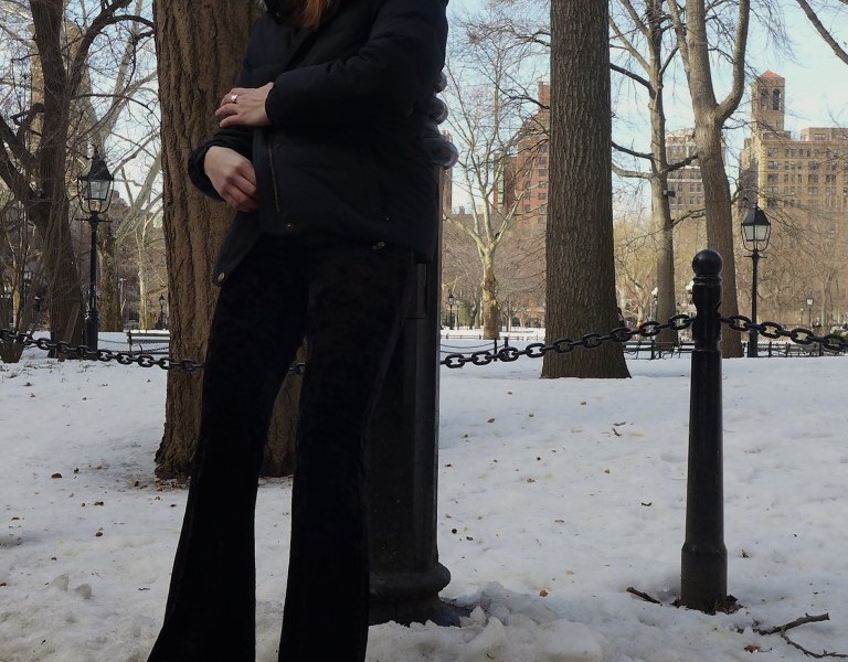 For my interpretation, I donned an all-black ensemble to emphasize the presence of various fabrics. My fitted turtleneck contrasts with the style of my velvet pants, which serve as my outfit’s statement piece. I figured if I was going to throwback to the ’90s by wearing velvet, I should really go for a vintage vibe with these retro flared bottoms. This type of fit, however, requires a heeled shoe to properly show off the wide legs. My wedges, also continuing the black theme, do the trick. I kept my accessories very minimalistic, wearing only one silver ring. Of course, I also wore my black puffy jacket to stay warm outside.