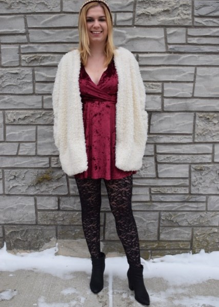 The starting point for putting together this outfit was the red velvet dress. One of my friends once told me, “If I were to choose one material to describe Kelsey, it would be red velvet.” I can’t say I disagree with her—I love to rock red velvet even outside of the holiday season. The crossover top of this dress works with the fit and flare skirt to create the perfect flirty silhouette. The fluffy, white jacket I am wearing over the top is by WhoWhatWear. I absolutely love how this jacket adds a bit of drama to any outfit, and it’s perfect for the winter time.