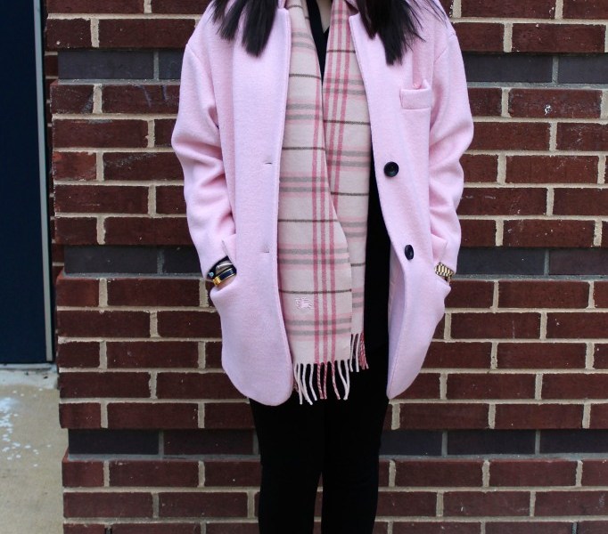 I paired my pastel pink coat with a pretty simple outfit featuring a flowy black top and my all-time favorite black Pixie Pants. I wanted the attention to be on my coat and I didn’t want to add too many other colors into the mix. I added a pink Burberry scarf whose color is very similar to the color of my coat but also has some darker taupe and gray stripes. My gray Tory Burch flats pull color from the stripes my scarf, tying the whole look together. When wearing a statement piece like my pink coat, it’s important to keep the rest of your pieces relatively toned down so your outfit doesn’t look too overworked.
