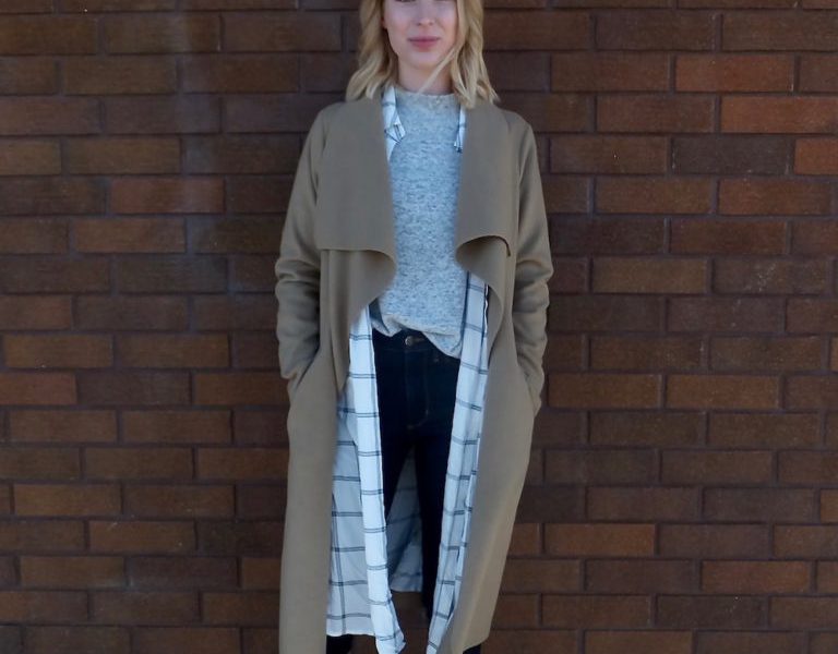 My second layer is what adds some oomph to the outfit. This sheer plaid button-down peeks out from under my coat and offers a transition between the warm-toned outer layer and cool-toned inner layer. The navy blue plaid design stands out against the white and brings subtle color into this outfit without venturing far from a neutral theme. This middle piece can also hold its own as the finishing touch on top of any sweater or shirt. When the coat comes off, the outfit still looks complete and refined.
