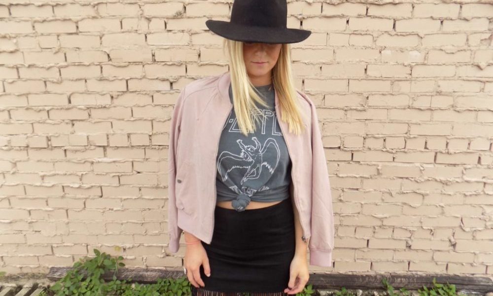 In this outfit, I was heading to a Sunday brunch with the girls. I didn’t really tamper with this rocker Led Zeppelin T-shirt; I added a cute touch by tying it into a front knot to break up the look. On the bottom I rocked a black fringe skirt to add some texture. This skirt is super fun and versatile. It can be styled in a laid back manner like this or dressed up for a Friday night at your favorite bar with some heels. To layer, I added every girl’s favorite jacket right now: the bomber. I normally don’t do pink, but this mauve color was one I couldn’t give up. It goes great when paired with darker and deeper fall—perfect for the season!
