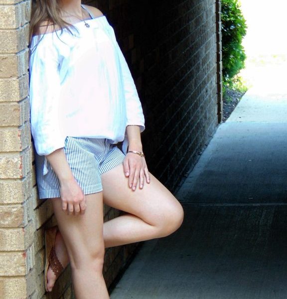 Since this blouse is simple, I coupled it with a pair of navy and white striped shorts to add a pattern to the outfit. These are mid-rise shorts, which allowed me to tuck the front of my shirt into the waistband, providing almost full visibility of the shorts. The navy and white stripes really get me in a summer mood because I almost exclusively see this pattern during the summertime.
