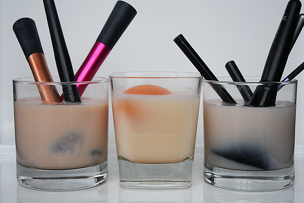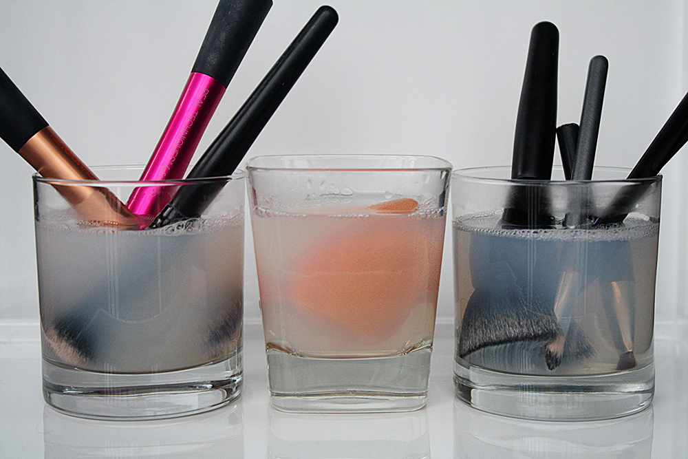 Insert makeup brushes and let soak in order to absorb the soapy liquid. Letting the brushes soak is crucial to break down the makeup build up.