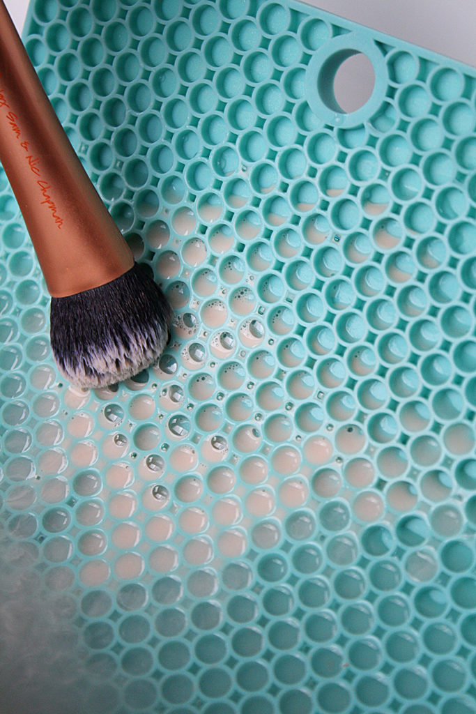 Rub the soaked brushes in circular motions on a silicone trivet to help work the soap through the length on the bristles. Next, rinse the brush using warm water. If you see there is still product residue, add soap directly onto bristles and massage until excess build up is gone.