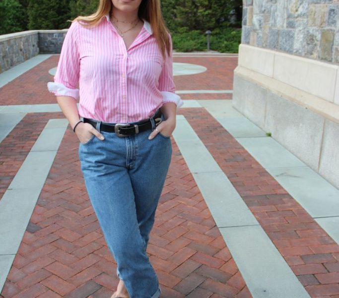 This look features the best of the ’80s with a modern flair featuring some of the popular trends of today as well. Obviously, the ’80s is a trend that isn’t going anywhere and this look really represents this timeless style. This look, fresh from campus, features a beautiful lightweight, pink, pin-striped button-down to bring in one of the popular colors of the ’80s. The top is then paired with vintage Levi jeans. The good old dad jeans are back and we love them! From boyfriend jeans to a vintage pair you should allows have a pair in your closet.