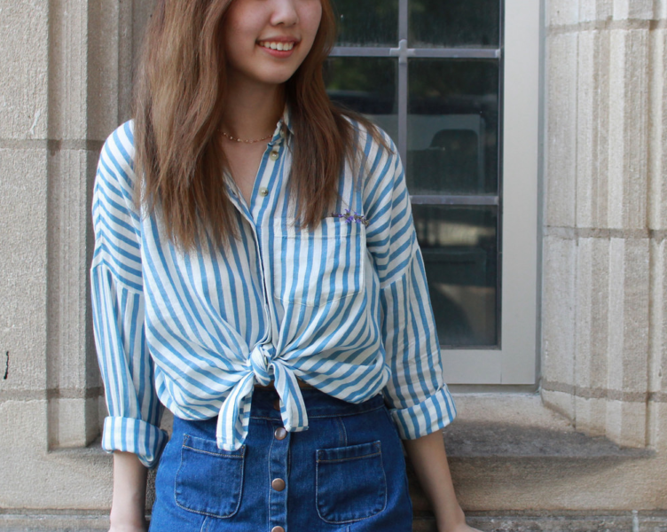 To prove it, I walked through the streets of Central Jersey in this playful blue and white seaside striped blouse. For a more flattering look, I left the top two buttons unbuttoned and then tied the bottom front into a bow to make the top slightly form-fitting. Next, rather than pairing the shirt with boring white jeans or shorts, I decided to go for a bolder look with a copper button-down denim skirt. Surprisingly, the two different colors of blue, instead of clashing, ended up complementing each other and drawing out both shades of blue. The combination of the lightweight blouse and the denim skirt allowed me to walk in ease through the 97 degree weather. Tip: If you want to make it even cooler. Unbutton the shirt and wear a spaghetti strap tank underneath.