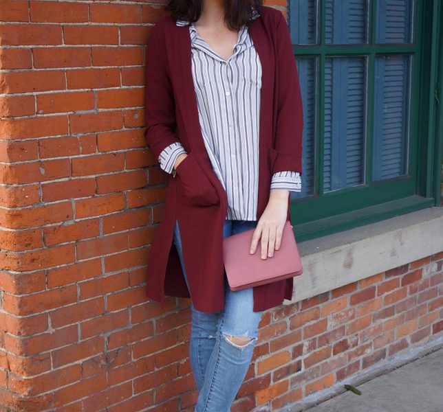 If your interactions are casual, then your jeans or a nice pair of leggings will do. Now, begin to swap out your graphic T-shirt for a blouse or button-down. We decided to give this Fashionista a hint of stripes to provide some variation to the look. You can stop there or you can add a blazer or appropriate cardigan (basically non-distressed). If you decide to implement this addition, pull your button-down sleeves all the way out. Just this alone can bring the whole outfit together.