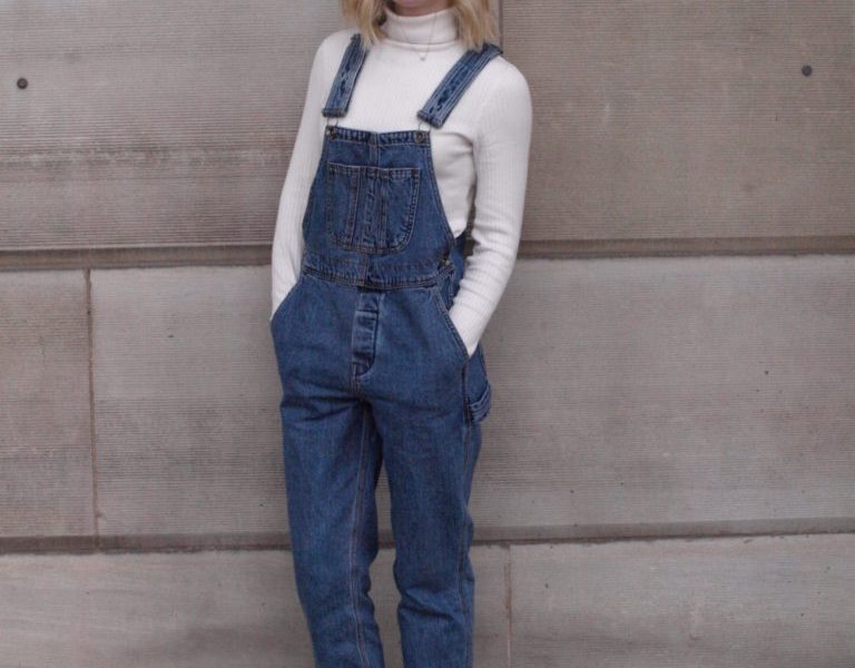 First, I noticed that she had on these adorable denim overalls that looked like the definition of comfortable. Overalls are a great piece to have in your wardrobe because they can add a certain playfulness to any outfit that would normally be worn with a simple pair of jeans. She was also wearing this white, ribbed turtleneck sweater that was equally simple and classy. The shoes that she chose to wear with this outfit were a pair of cute gray booties with a golden accented heel. I also noticed that she was sporting some colorful socks, to add a touch of whimsicality, and also had on a small cross necklace; the perfect balance for this casual outfit.