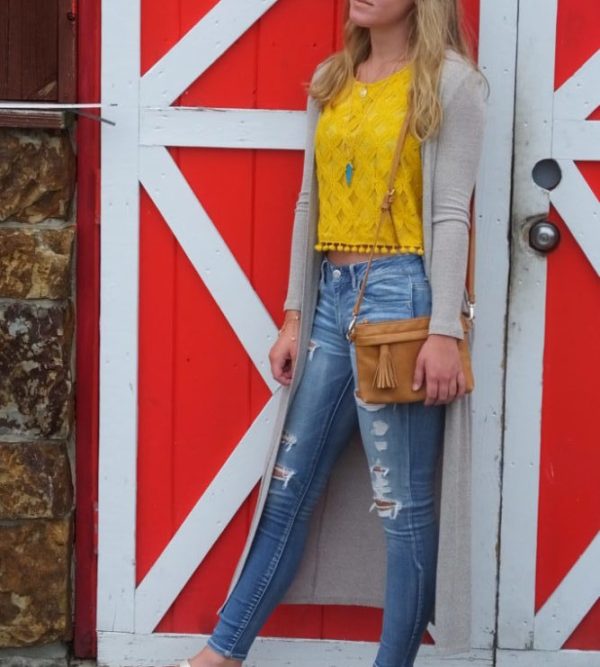Starting her look she pairs some distressed light wash jeans (a back-to-school basic) from American Eagle Outfitters and a bold floral tank to add a pop of color. Adding a long flowy cardigan from Forever 21 completes the look and helps to ensure you won’t freeze in any of your classes. Layer some gold delicate necklaces, a trendy charm bracelet and a small cross-body bag to accessorize your outfit. Finishing the look off with a pair of Birkenstock sandals gives her the comfort she needs to spend the day walking across campus while also staying on trend. All she needs is a notebook and pencil because this Fashionista is ready to kill it on the first day of class!
