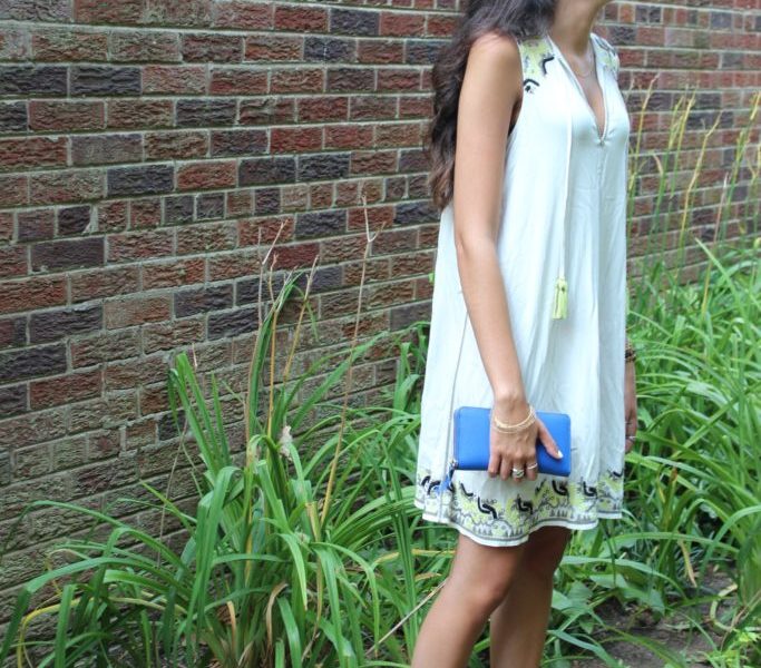 A ongoing trend we have seen year after year and specifically again this summer is the classic swing dress. It is a comfortable go-to summer outfit that looks great. This Fashionista is rocking this lightweight embroidered swing dress. The light color is cool against the sun and the shoes add another casual but stylish feature to the outfit. The embroidered detail and hint of one of summers hottest trends, tassels, really make this outfit unique and cute. The outfit being very simple has a subtle fun pop of neon lime green in it to ensure that the dress stands out.