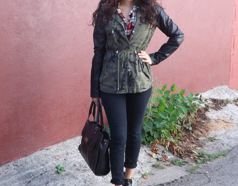 This look is perfect for class because the plaid shirt provides that classic, preppy back-to-school vibe, while the camouflage studded military jacket gives the outfit an edgy twist. Pairing the two patterns with simple black jeans, booties and a faux leather bag allows the patterns to stand out and make a statement on their own. This outfit’s best feature is its versatility. It can easily be worn without the jacket for the warm end-of-summer days still ahead, but is also the perfect layer to add during those chilly September nights and the cold fall days that are right around the corner.