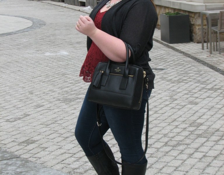 Usually the boots and jeans combo is finished off with a chunky, oversized sweater. But instead, this Fashionista opted for a thin, three-quarter length gray cardigan to wear over her wine colored, lace peplum style top. Due to the cardigan being a jersey material, the change of fabric with the lace top really made the overall outfit stand out. The wine color also gave a dark-colored ensemble the punch of color that it needed.
