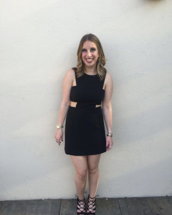 This Fashionista is rocking a black cutout, short A-line dress with lace-up black high heels. While she may just be wearing a black dress, this dress is anything but boring. The cutout below the chest is enough to make the dress interesting, yet still appropriate. In addition, her lace-up black heels elongate her legs and bring excitement to the outfit.