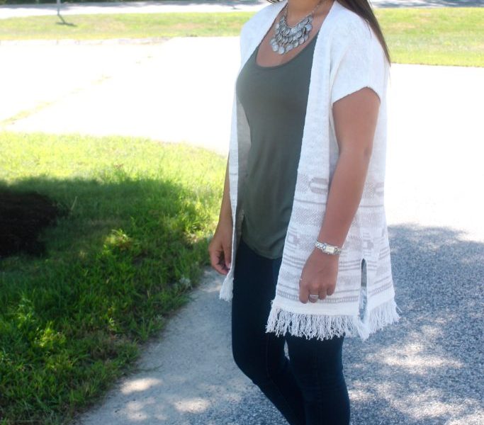 She conquered transitional, late summer style for her first day of classes. This Fashionista incorporated some summer feels with boho accents like the cardigan’s fringe and her woven sandals. Her silver, statement coin necklace gave off some gypsy vibes and certainly stood out against her sun-kissed skin. Paired with dark wash jeans and an olive T-shirt, she could easily layer on a jacket and trade the sandals in for booties to take this outfit to cold weather ready.