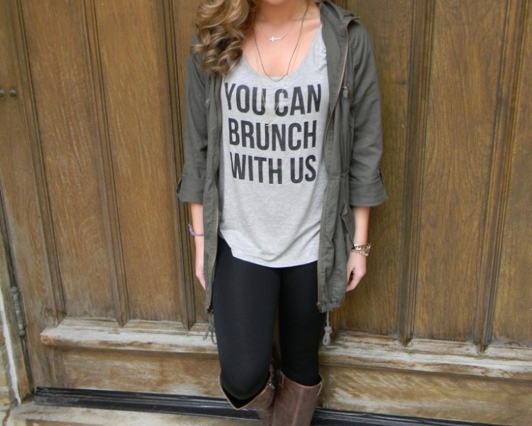 After a long weekend of either social events or studying, comfort is always the answer. This Saint Mary’s Fashionista found the perfect balance between trendy and comfortable without being too overdressed for a midday Sunday meal. She combined a green military jacket over a casual graphic T-shirt with the quote “you can brunch with us,” perfect for the occasion. By adding a pair of distressed riding boots and leggings (a.k.a a college girl’s best friend) are a must for achieving ultimate comfort.