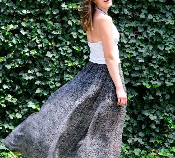 This summer, you can’t go wrong pairing your favorite white tank top with any variety of bottoms. This trendy Fashionista kicks off her look with a staple halter tank paired with a maxi skirt, creating an effortless ensemble for the season! The patterned maxi skirt is a perfect compliment to the simple top. It’s lightweight and breathable material makes it appropriate for the hot summer weather, and the elastic band on the waist allows for that extra room for the inevitable brunch food baby! (Yes- that means no discreet unzipping of the skinny jeans will be taking place under the table.)