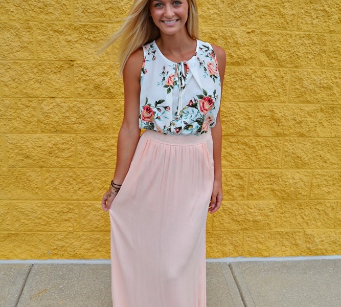 One Simple Change: To make this outfit look more like a girl’s night out look, simply change the floral top to a white crop top, add a layered choker and change the sandals to heels.