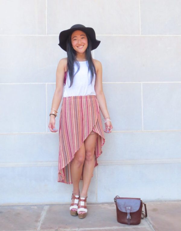 This Fashionista pairs a stripped multi-colored asymmetrical skirt with an crisp white sleeveless tank top. She balances the white and adds a base color by wearing a pair of brown and white wedges and donning a brown leather bag. The nature of the wedges, with its straps and use of color-blocking, adds an edginess to her outfit and her bag does her justice by not overpowering her and allowing her to freely move yet keep all of her necessary items all in one place.