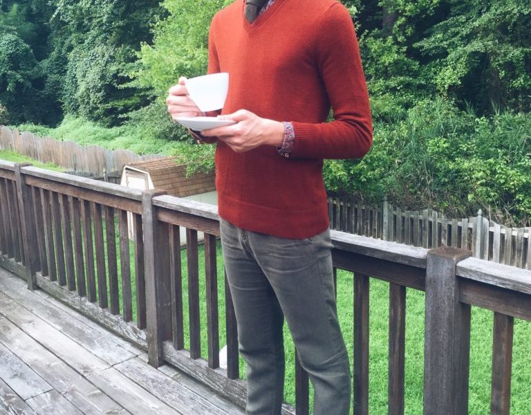 The mix of the printed paisley shirt with subdued color hues, really pops underneath the solid maroon sweater whose color can be found within the print. This is also a prime example of stylish and functional layering. First with the coat, all the way down to the collared shirt underneath. If a fall breeze was not kicking in on a particular day he could shed two layers, then do vice versa in case of an overcast. The pant could also be cuffed for a cooler look, or unfolded to completely cover the ankle.