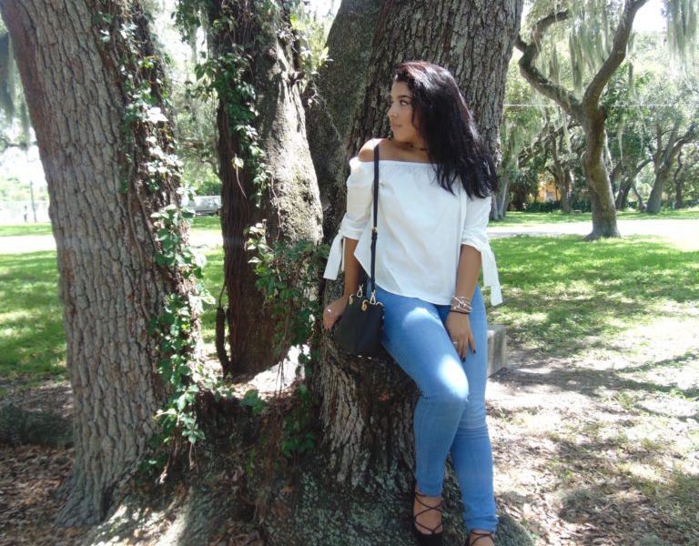 Something about a crisp white shirt makes it stylish every single time. Pair it with a tailored pair of jeans and you have a totally timeless look. Combinations such as these hold their own in a would of fashion fads, as bright white shirts and classic blue jeans should be staple pieces within any wardrobe. The star of this look is definitely the shirt; this Fashionista incorporates the modern trend of an off-the-shoulder top, while still looking timelessly chic.