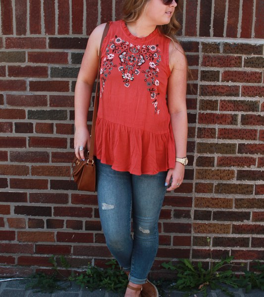 Decked out in everything Target, this Fashionista styled an easy and on-the-go look while staying on a budget. The focal point of this look is the peach and floral embroidered, peplum tank. Floral accents add a soft side to any look and are super feminine. The top flows beautifully over this Fashionista’s cuffed, denim, blue jeans. To keep this look comfy for the mid-morning meal, our Fashionista paired ankle strap sandals with a unique braided detail. In color coordination with her shoes, she paired a faux leather crossbody bag with gold accents from Forever 21. For the finishing touches, the Fashionista added her gifted rings that she never leaves the house without and a gold watch for a pinch of sparkle. This Fashionista took essential college wardrobe pieces and turned them into a soft and feminine look for brunch with friends.