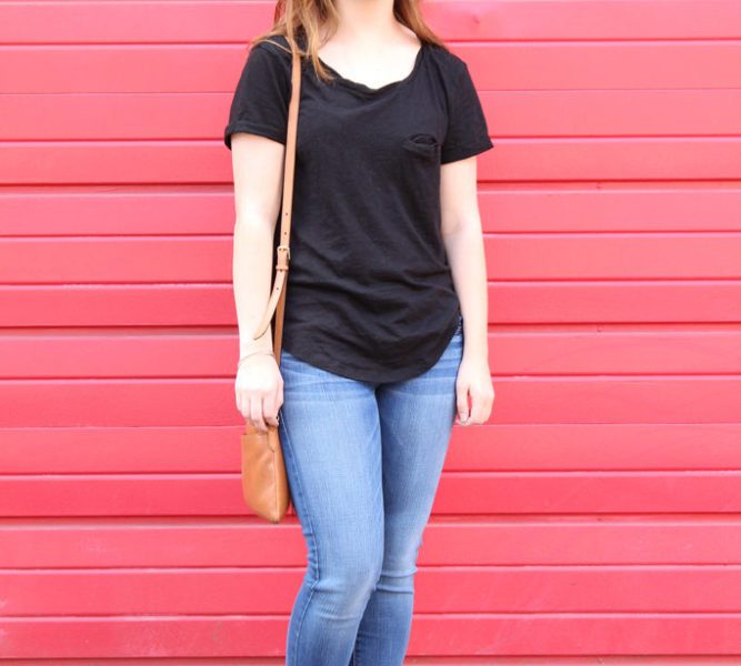 This Fashionista decided to keep things laid back, opting for a pair of go-to, comfy blue jeans. Cuffed at the ankles, these jeans are the perfect piece for transitioning from summer to the impending fall. And, as we all know, nothing goes better with jeans than a rad T-shirt. You can never go wrong with a black t-shirt, no matter what the time of year is. This Fashionista paired this staple piece with a few other staple items, like her too cool aviator sunglasses, perfect for protecting her eyes from some intense UV rays, and a cute little leather brown bag. Having the perfect small cross-body bag is a must have for every Fashionista’s closet— you can match them with so many outfits, and they are perfect for every occasion. I, myself, have a little black leather bag that I use all the time so I can attest to their power!