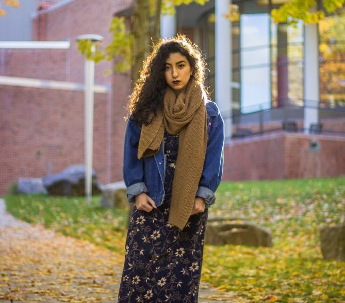 This Fashionista starts off her outfit by tackling one of the latest fashion crazes: the white T-shirt under a dress. By pairing a simple white T-shirt with a dress she got from her mom, the T-shirt creates a light background which contrasts the dress and allows the flower print to pop and be a main focus of the outfit. On top of her dress and T-shirt she put on a thrifted denim jacket to combat the cold and add another layer. As an extra detail, she rolled the sleeves of the jacket to fit her better and to give another casual vibe to the outfit. Denim jackets are not only a great and versatile option for outerwear, but they also allow the outfit to be dressed down a little for class and normal day-to-day activities.