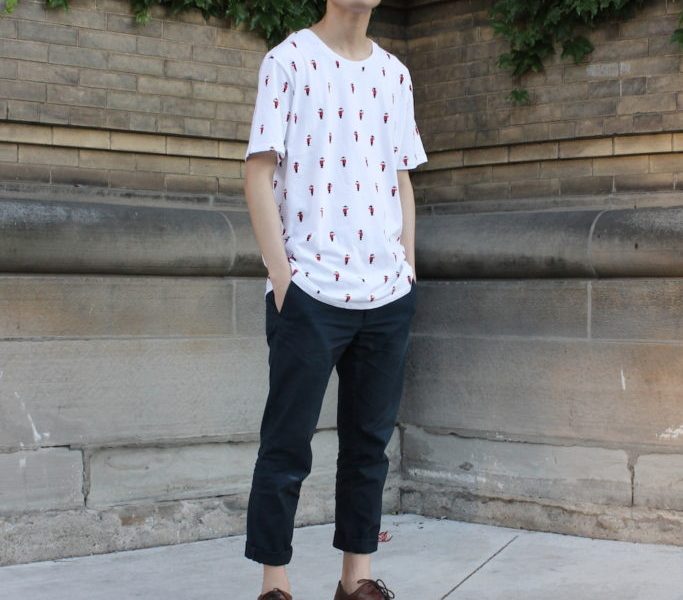 This Fashionisto does Canadian style right by creating a subtle yet thematic outfit that can be worn both for the occasion and out. The star of his outfit is this limited edition “Mountie” printed graphic T-shirt from Toronto’s very own Drake General Store (more nationalistic pride here). Mounties or the Royal Canadian Mounted Police (RCMP) are our federal and national police force, easily recognizable with their bright red uniforms and taupe hats. The T-shirt is filled with small pixelated saluting RCMPs, can you get any more Canadian than that?