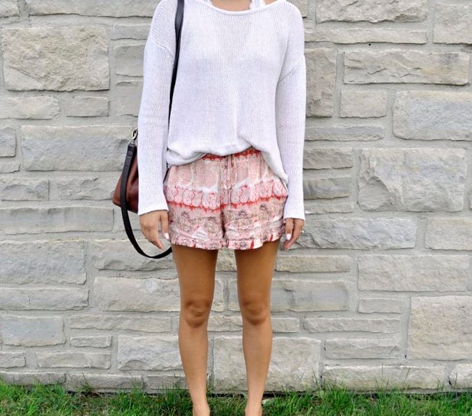 Since it’s been pretty humid, the buildings on our campus that have AC in them love to blast it, and in some classrooms, it feels like you are in Antarctica. For her full day of classes on this humid and rainy day, this Fashionista paired some boho colorful, flowy shorts with a very soft, light, knitted pullover over a white bralette and finishing it off with her neutral suede Birkenstocks. Her outfit as a whole works very well; the pattern on her shorts is what the main focus of her outfit is. The color of the pullover matches perfectly with her Birkenstocks, pulling it all together by giving off a very comfortable look. The pullover look is perfect for those classes she may have that are located in the extra cold classrooms. This makes for a super easy and cute look to throw on before class.