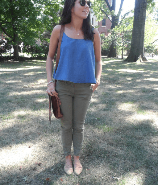 She paired a flowy denim tank top with a pair of olive green skinny jeans. She combined these two with a simple yet beautiful series of gold bracelets and a brown leather bulk bag to carry her books to and from class. Accessories such as bags, necklaces and bracelets are essential to dressing up this simple look because they add some sparkle to the outfit. Sam wore a pair of ballet flats which very nicely complimented her pants, kept her feet comfortable for the commute across campus and kept the outfit nice yet casual.