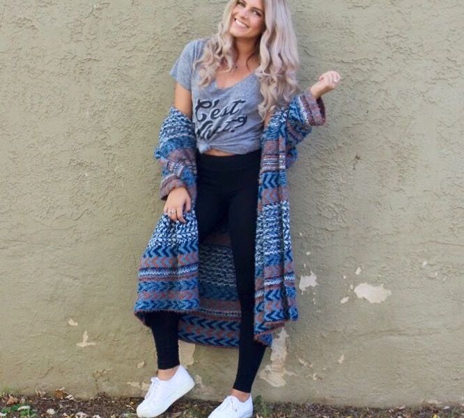 This Fashionista shows off comfy and chic at its finest. She paired a simple black legging with a trendy off-the-shoulder graphic T-shirt. To make the T-shirt a little more fitted, she tied in a tiny knot. The knot is on trend and it makes a bigger T-shirt look way cuter. As I said, the big comfy sweaters are key in any wardrobe. She has an amazing big Free People sweater to add the comfy side to her outfit. This sweater is amazing and very universal with any outfit. Even though it is still warm, you definitely need a sweater for those 8:00 a.m. classes. To finish off her look, she paired a white sneaker with her outfit. It is all about comfort for class and especially walking to class, sneakers are a must. This outfit stood out to me because it can accommodate any Fashionista out there.