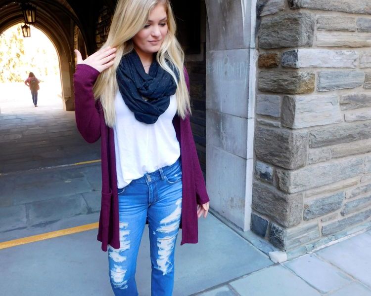 But, what us college students often forget is that fashion can be comfortable! For instance, just take this Fashionista’s look. She rolled up to class looking adorable, and her outfit was far from uncomfortable. Most people have the misconception that jeans are equivalent to scathing discomfort, but there are so many soft and stretchy pairs out there. This Fashionista discovered the perfect pair of boyfriend jeans to rock to class. The frayed detail at the bottom is totally unique and on trend, and the ripped detail of the jeans brings her outfit to the next level of cool. Her slouchy tank top, oversized cardigan and scarf combination is the definition of the perfect fall outfit; especially since it has still been a tad too warm for parkas just yet. This Fashionista finished her look with some black buckled booties, excuse the alliteration, and aviator sunglasses to block out the mid-afternoon sun as she treks across campus.