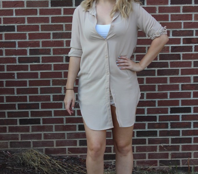 This Fashionista paired her long blouse with some lace shorts. By layering this thinner material, you add more material to the look, which you basically have to do when it comes to thinner shirts. But nonetheless, they went perfectly together! Adding in some uniquely tied combat boots brings a nice, rustic feel to her whole look. Since the blouse is oversized, it doubles as a shirt dress. And the sides pull up just enough to see the bottom of her gorgeous lace shorts.