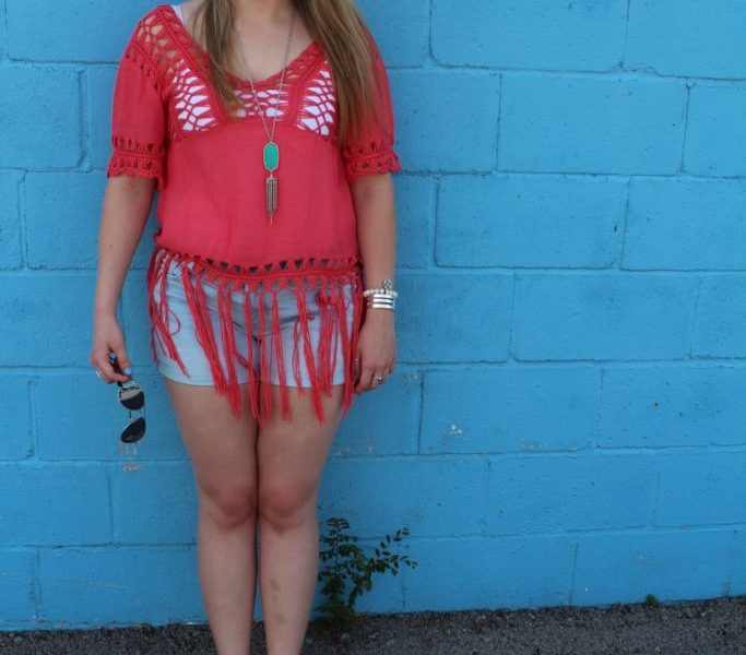 One Simple Change: If this Fashionista could make one simple change about this outfit, it would entail swapping the classic white shorts for a pair of skinny jeans for fall. By swapping the white shorts for skinny jeans, the Fashionista has created a dressier outfit that’s perfect for cooler weather. Whether the Fashionista opts for the white shorts or skinny jeans, this look is sure to gain her a fair sum of double takes by those around her. The fringe ultimately makes this top an essential piece to anyone’s closet this season, hopefully next season too (fingers crossed). Also, check out the breathtaking color combo!