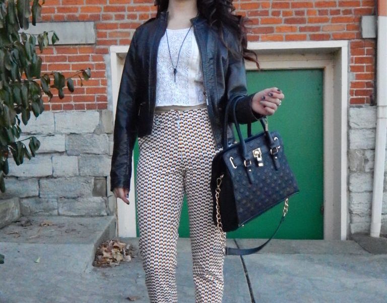Her look brought together a lot of unexpected elements into a versatile and composed outfit. She started with an off-white, lace crop top. Cropped tank tops are an essential in the summer, but when incorporated into winter outfits add a feminine and almost boho feel to any outfit. She paired the top with a pair of brightly patterned, high-waisted trousers. This Fashionista knows that the lace pattern of her top is no limitation, and picked a bolder print to keep the pants as the outfit’s focal point. She topped off the outfit with a brown leather jacket to keep warm and bring all of the outfit’s neutral tones together.