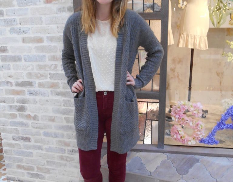 Her lightweight top keeps the outfit from looking too heavy, while the long knit cardigan provides much needed warmth. Throw on a parka and this outfit is perfect for those first few weeks back to school. It’s fun and bright, while still providing enough warmth for trekking across campus. What makes this outfit so versatile is the layering; combining pretty, lighter pieces with heavier pieces keeps the outfit from looking drab or heavy, while still being functional. This outfit can take this Fashionista from class, to dinner with friends, to meetings for school clubs, without a problem.
