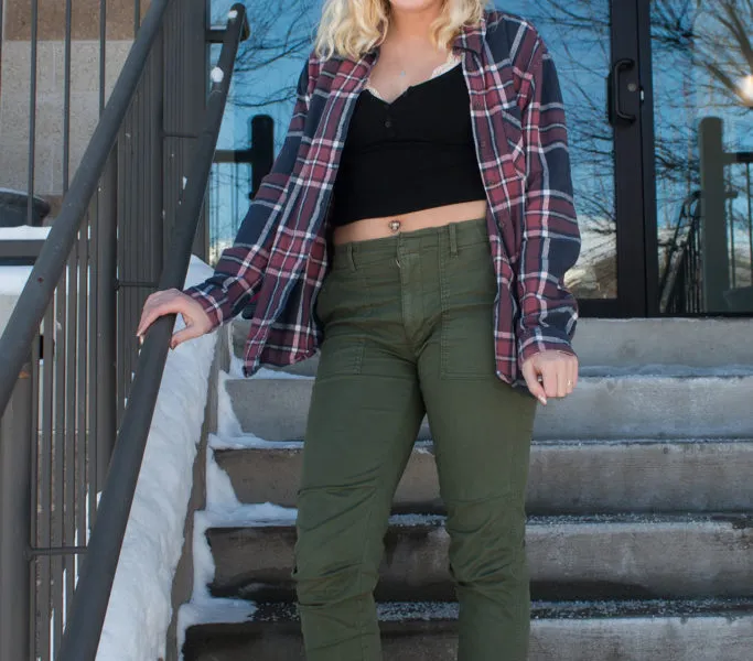 Due to the brutal Wisconsin winters, it was essential that this Fashionista found a way to stay warm even while wearing a crop top. She paired her crop top with a thick flannel shirt to make the outfit a little more cozy and winter-friendly.  Not only is the flannel warm and cozy, but it’s cute and adds a great deal of color to the outfit. Apart from the crop top and flannel, this Fashionista decided to go with a pair of green pants, black combat boots and a brown lipstick. This combination gives the outfit more of an edgy vibe. She choose to wear a lacy bralette under her crop top. Bralettes are a great way to stay comfortable without sacrificing style. The bralette adds a feminine touch to an otherwise edgy outfit. This provides the outfit with a nice sense of balance.