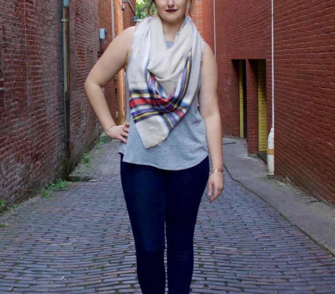 Be warned: blanket scarves can become overwhelming when paired with too many other bold outfit pieces. So definitely take notes on our Fashionista, as she does the blanket scarf justice. Paired with a simple top, dark wash jeans and to-die-for booties, this outfit deserves an A+. While you could also pair this particular scarf with light wash jeans and a red or blue top, dark wash compliments the color scheme of this scarf. I also suggest going more towards dark wash for the cold season, as it coordinates best with most combat and riding boots.
