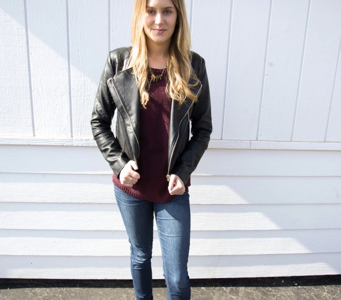 This Fashionista has put together a look that not only seems fashionable and comfortable but also is a prime example of her own style. Her look shows off her edgy style all while still adding a pop of red without overdoing it. By pairing a cranberry knit sweater with a black leather jacket and a pair of black leather booties, she is sure to catch her crushes attention. He Laid back look shows that she isn’t trying to hard and is comfortable with expressing her more rocker side.