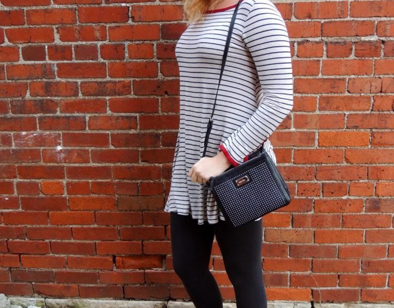 I know you’ve been lying around in your pajamas for the past few weeks but just because you have to journey outside doesn’t mean you can’t be just as comfy. Just put on your favorite pair of leggings and instead of a dingy sweatshirt add a cute swing dress. This Fashionista’s striped swing dress adds pattern and color to the look. Her booties are great for running around in and help dress up the outfit. Her studded bag is the perfect size to hold all those gift cards she got over the holidays.