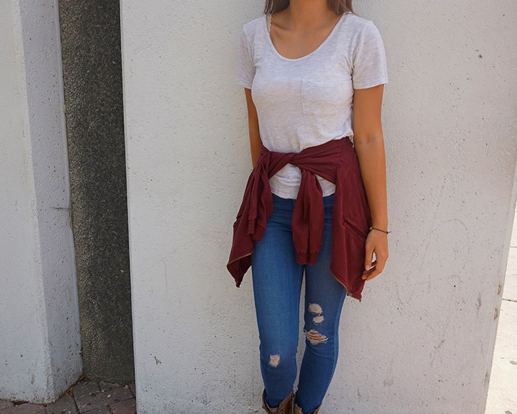 Basics are always necessary when building a wardrobe. The basics can be paired up to dress an outfit up or down. This fashionista completely nailed it with her effortless style. The perfect white v neck tee, blue distressed denim jeans. Who needs a belt when you can tie your hoodie around your distressed denim jeans and basic T-shirt? It’s great to be able to pair an outfit together with plenty of basics to choose from. While running errands and running around like a loose chicken you definitely want to be comfortable. A comfortable tee that you can wear over and over again. The hippest of the hip jeans to add personality to the overall look. Let’s not forget the booties that complete the whole look. The inspired club mastered Ray-Ban shades she’s wearing are classic and perfect for the sunny summer days.