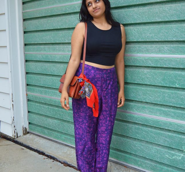 This Fashionista not only chose a gorgeous design for her pajama pants, but also they look so comfortable that I had the urge to go and buy some for myself. Also, I truly admire how she pulls off those loafers with ease. Some people may think they look a little tacky, but, like this Fashionista, sometimes all you need is a little confidence to wear rock your favorite pair of classic shoes. This ensemble is a perfect example of how the balance between tight and loose fitting pieces adds even more possibilities to your outfit selection, presenting the opportunity to utilize all of your most comfortable pants (and as college students, that is a HUGE plus). On the subject of color, the complement between the vibrant purple and red-orange patterns and matching of the tan-brown shoes and satchel establishes an expressive color scheme reflective of her personal taste, which I absolutely love. The adorable addition of the scarf around her satchel is another fun detail that I couldn’t keep my eyes off of—this goes back to the suggestion that you shouldn’t avoid showing off your personal taste, even when styling a casual outfit. There’s so much room for creativity!