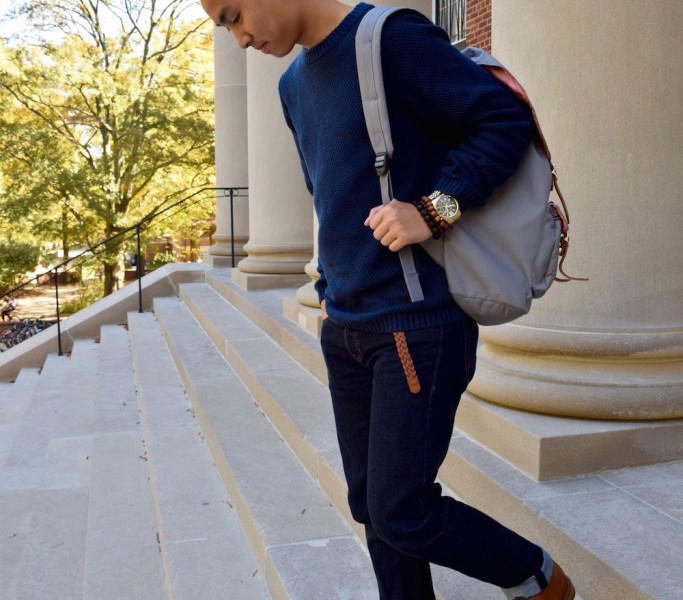 This Fashionisto chose to keep things simple and stuck to an overall dark color palette. Staying in the same color scheme is a smart trick for any season as it prevents your outfit from looking too busy. This Fashionisto wore a navy sweater and dark blue jeans. The sweater is warm, but not extremely warm. Thinner sweaters are perfect for fall. Next, this Fashionisto matched his belt with his shoes which is a fashion must as It brings a sense of cohesion to the entire look. He also cuffed his jeans. Cuffing your jeans is not only trendy, but also extremely practical as it in a way tailors them. Not to mention, it can also add a polished touch to any outfit. To finish off his look, this Fashionisto accessorized with a gold watch and some stacked beaded bracelets.