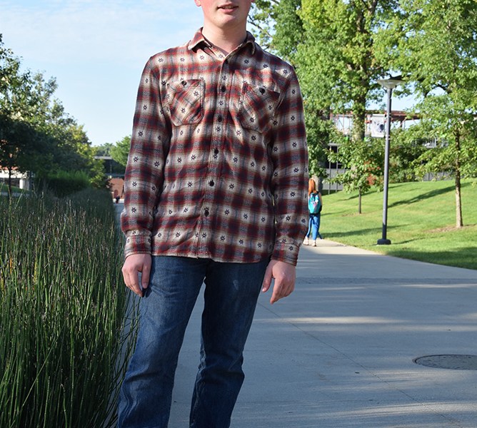 This Fashionisto is ready for autumn to hit with the hues of red and green sprinkling his shirt. The patterns in his flannel bring out a Midwestern feel that is perfect for a casual everyday look. With his big chest pockets, it accents his flannel and adds character to his top. The dark jeans give off a more sophisticated vibe that pairs well with the patterned flannel. The loafers complement his attire and match his glasses with their dark brown color that ties the outfit together. The glasses create an intellectual side to his look that is able to make his outfit stand out from the crowd.