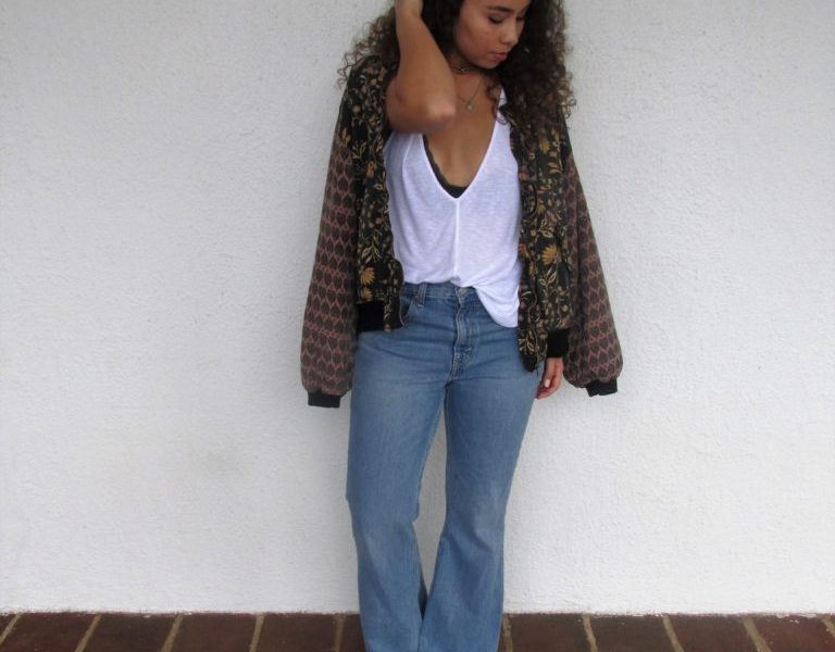 This Fashionista did transitional fall perfectly. She decided to stick with a super bohemian yet sophisticated low-cut tank top with a black bralette underneath. This Fashionista paired this top with a new denim trend for the fall, wide leg jeans. I love the look of wide leg jeans. I think wide leg jeans are the most versatile pair of jeans you can add to your closet and can match any personal style. You can pair them with a loose top like she did, or you can pair them with a belt and a crisp button-down for a classic look. To cover up and keep warm, she paired the outfit with a printed bomber jacket perfect for the fall days. The jacket adds a twist and unexpected look to the outfit.