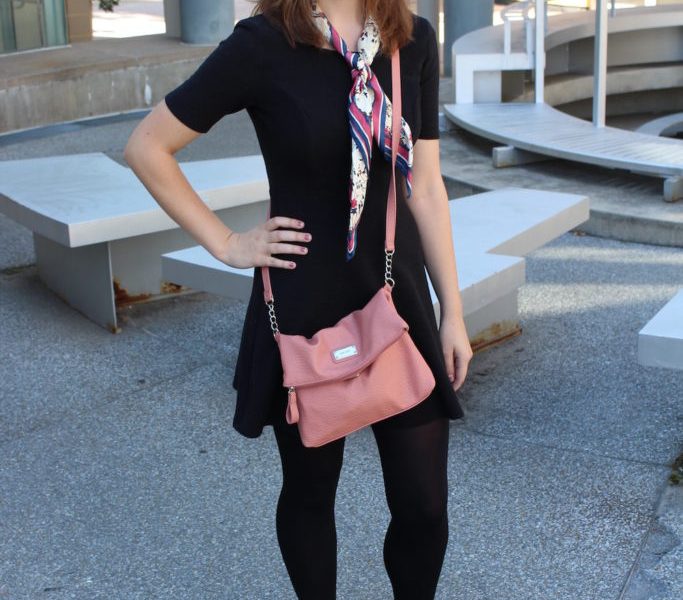 Her scarf adds the right amount of interest needed to spice up an all black outfit.  The floral print is beautiful and pairs well with the stripes. The way she tied the scarf sets it apart from the typical circle scarves spotted around campus. This Fashionista’s slouchy, dusty rose shoulder bag is the perfect compliment to her scarf. The color pops beautifully against her black dress, while still being a great, muted shade of pink, which is perfect for transitioning into fall. Carrying a purse is a perfect alternative to a bulky backpack on days with few classes or books to carry around. This Fashionista is clearly prepared for a very stylish fall.