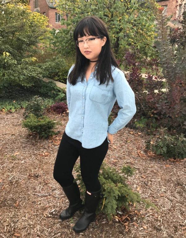 Rain boots are definitely a must in Michigan. You never know if it is going to rain or snow, so it is just better to be safe than sorry. Plus, they go with almost anything. This Fashionista paired her Hunter boots with a pair of leggings and a chambray button down. Leggings are always a good choice because they are comfortable and don’t constrict you from moving, while the chambray shirt gives your outfit a subtle pop of color.